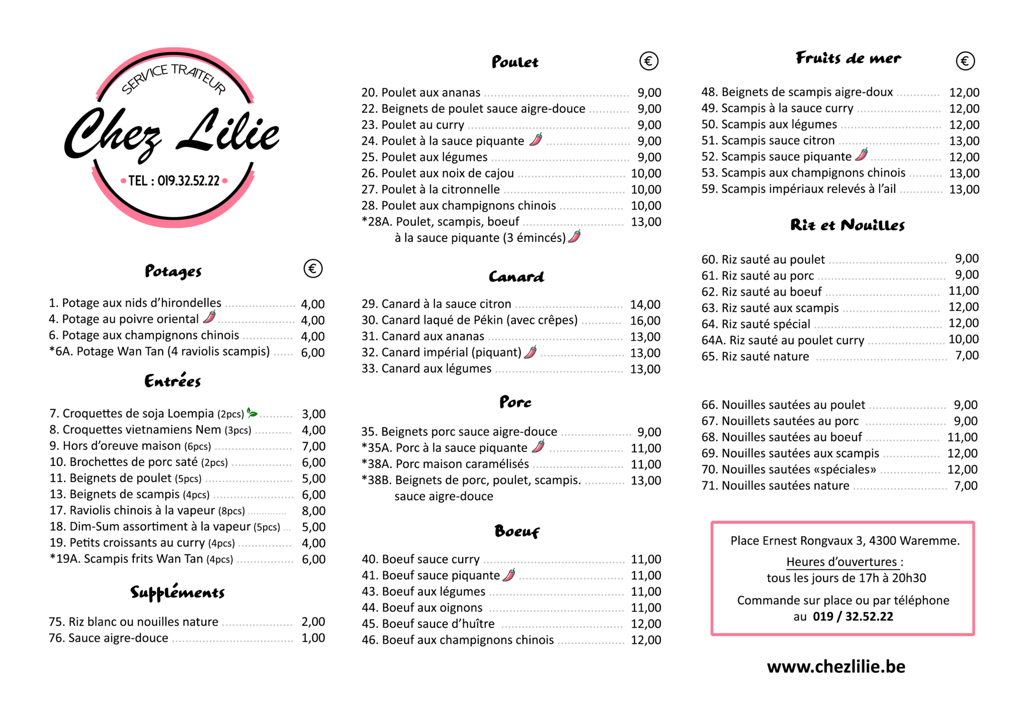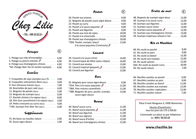 Plats asiatiques et chinois à emporter, commandes par téléphone uniquement pour le moment.